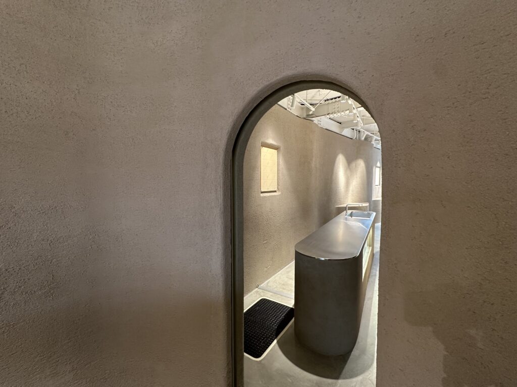 壁・カウンターはすべて曲線構成。左官仕上げならではの一体感を出すため、下地精度を重視しRの連続性やエッジの丸みを現場で細かく調整しています。開口部のアーチ状も角を感じさせない納まりとし、空間の流れを途切れさせない仕上げとしました。