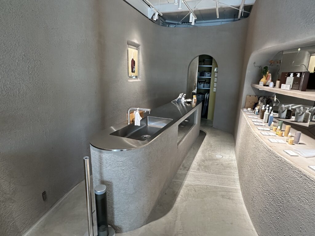 今回ご紹介するのは、左官仕上げを基調とした店舗内装工事です。空間全体に曲線壁。左官テクスチャー・金属仕上げを活かした内装工事をしました。